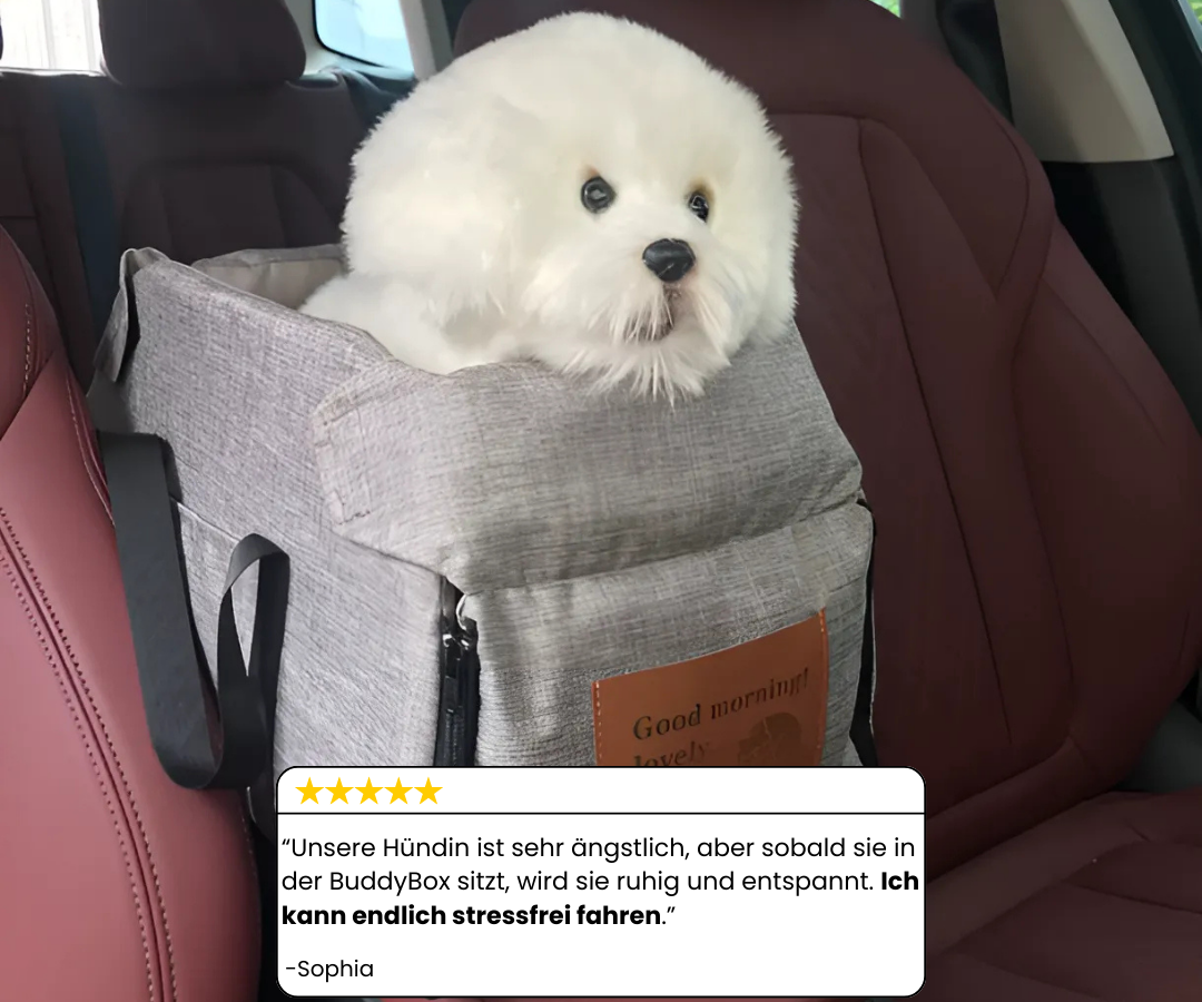 Mit der BuddyBox sitzt dein Liebling ganz entspannt und sicher auf der Mittelkonsole. Er kann rausgucken, sich ankuscheln, hat dich im Blick – und endlich wieder Ruhe im Auto.